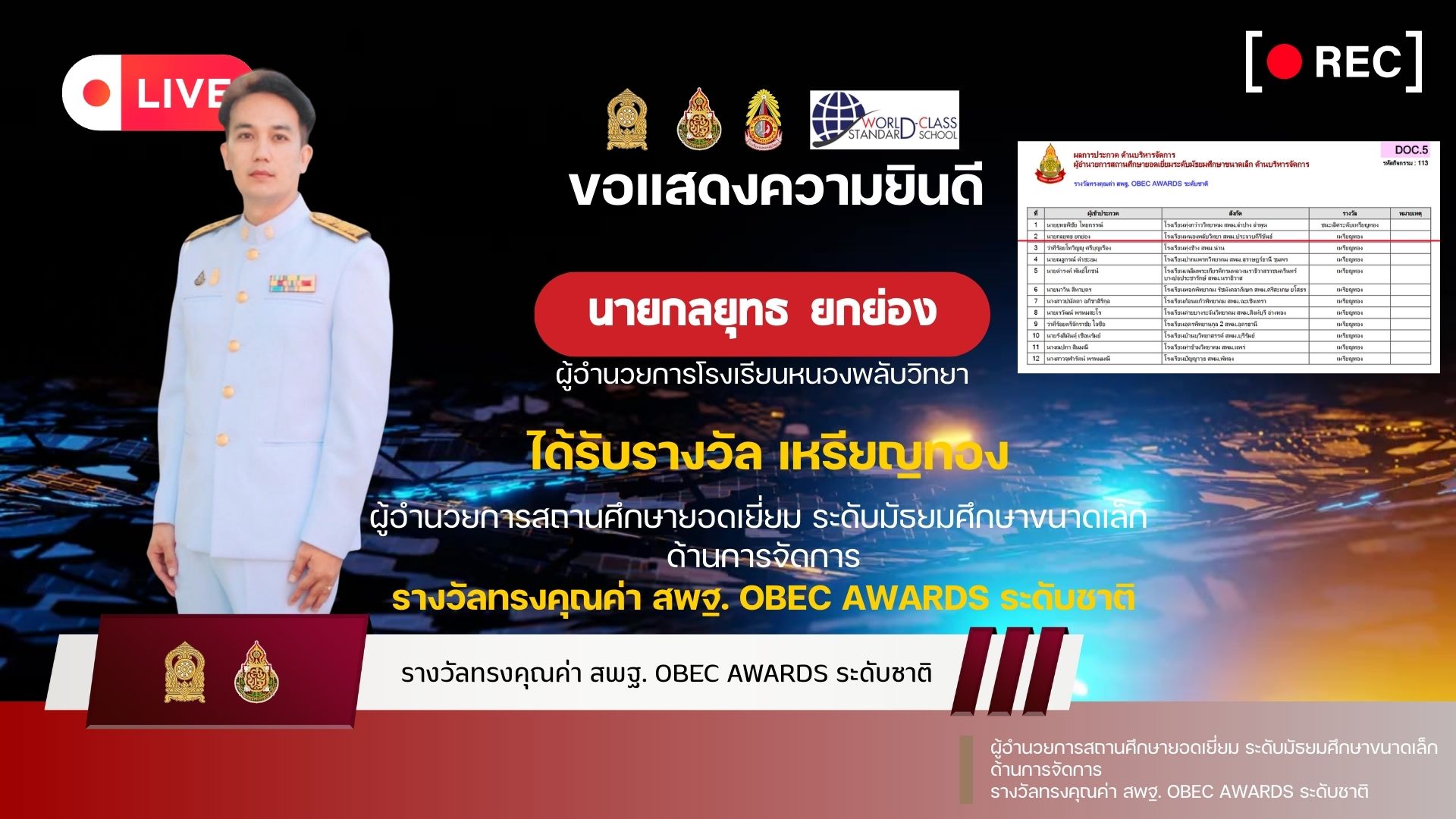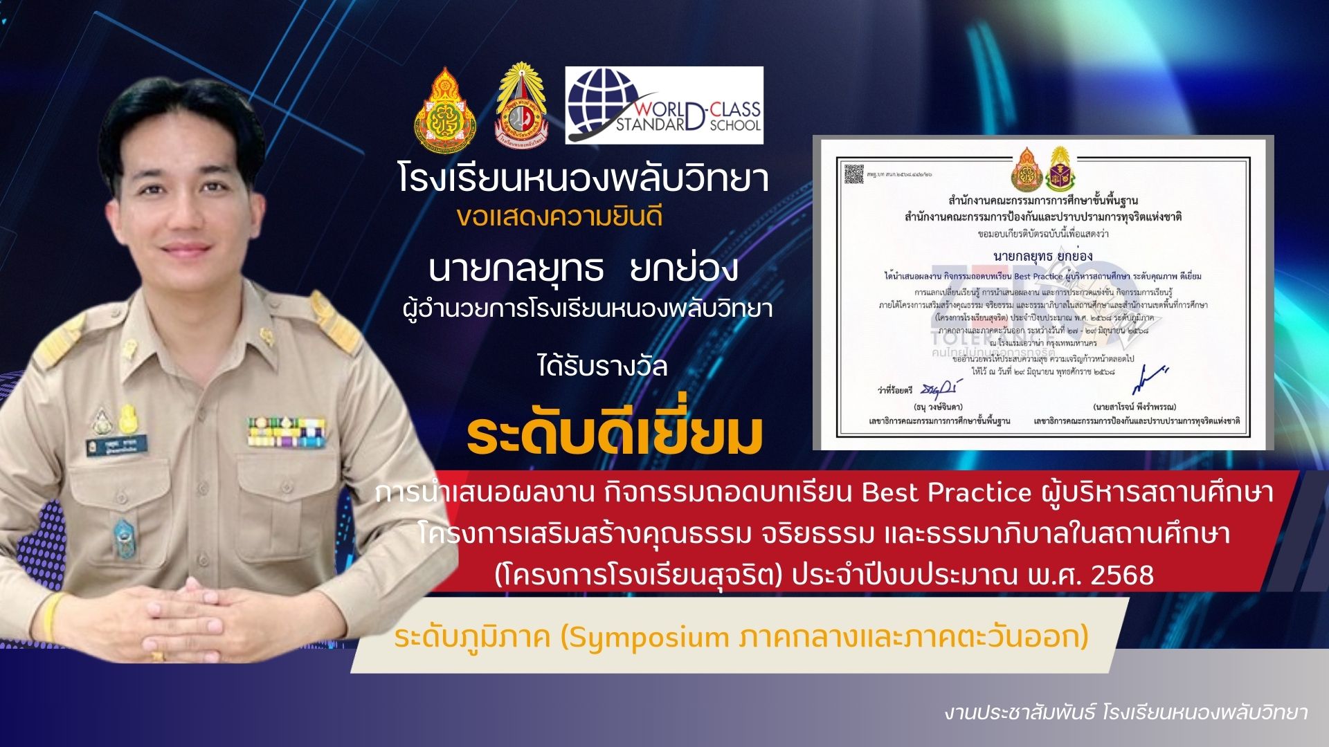 นายกลยุทธ ยกย่อง ผู้อำนวยการโรงเรียนหนองพลับวิทยาได้รับรางวัลระดับคุณภาพดีเยี่ยม อันดับที่ 1 นวัตกรรมสร้างสรรค์คนดี ของผู้บริหารสถานศึกษา